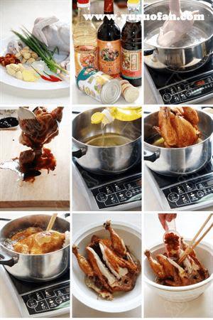 3、取一个大碗,将炸过的童子鸡以皮朝下放入碗内,然后把其余的材料及调味料放入鸡内。