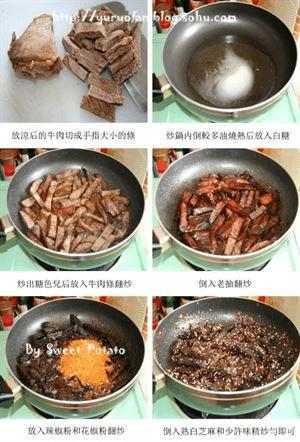 5、一直用小火翻炒至牛肉较干以后,放入辣椒粉和花椒粉翻炒均匀,最后起锅前倒入白芝麻和少许味精炒匀即可。