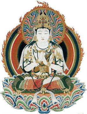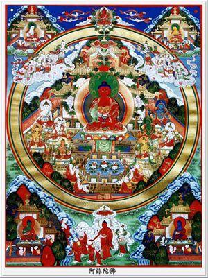 阿弥陀佛,其名号梵音为amitayusa(无量寿)、amitaba(无量光),别名无量寿佛、无量光佛、观自在王佛、甘露王。密号为清静。他是西方极乐世界的教主,与观音菩萨、大势至菩萨合称“西方三圣”。