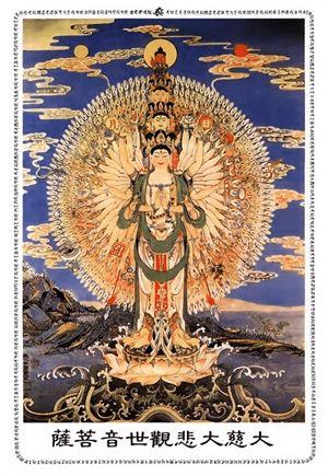 据佛教典籍记载,千手观音菩萨的千手表示遍护众生,千眼则表示遍观世间。唐代以后,千手观音像在中国许多寺院中渐渐作为主像被供奉。千手观音的形象,常以四十二手象征千手,每一手中各有一眼。