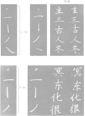 既然行书与楷书相互联系,而且在某种程度上,我们还可以把楷书看成是行书的基础,那么楷书的运笔方法、笔画形态、结体的基本规律就能灵活地应用到行书中。然而,行书与楷书又有实质性区别,这种区别就体现在是否“牵丝萦带、流畅便利”上。也就是说,行书也有相应的字法,而且同一字的行书往往有多种写法,但这些写法一经约定俗成,便具有相对的稳定性。因此,我们在众多的行书体中总结出从楷书过渡到行书的一般规律。一是在部分楷书笔画的基础上增加“钩、挑”两个“附件”(这是由于行书出锋快而引起的);二是将楷书的某些笔画减省,以至改换少数楷书字的笔顺(这是出于牵丝萦带的需要)三是将楷书的方折笔画写得圆转些(也是为了便于牵丝萦带),或以点替代楷书的某些笔画。