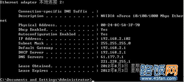 ②命令行模式查看:电脑开始----运行----输入"cmd”命令,然后在DOS窗口下输入"ipconfig /all"命令,则可以查看当前IP地址详细信息。
