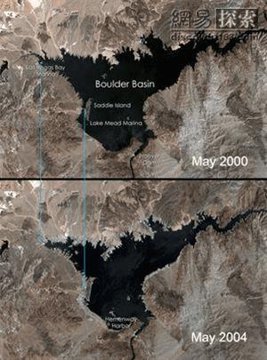 8、盯住世界最大水库之一的密德(Mead)湖观看,此卫星图像揭示其水平面在2000-2004年的4年里出现急剧下降。此地区的严重干旱导致一些专家预测此湖将会在2021年前干涸。