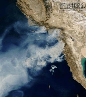 2、此吞噬美国南加州的森林大火的快照是由美国宇航局的阿卡(Aqua)卫星于2003年10月27日拍摄的,只见一股股灰褐色的浓烟从洛杉矶西南部的山脉腾空而起并蔓延到太平洋沿岸。大火从桑塔巴巴拉蔓延至美国与墨西哥的边境,烧毁了沿路上的草丛、灌木和树林,迫使成百上千的居民离开家园,还夺走了7名保护家园的消防队员的生命。图片中的红点是不同的火焰。