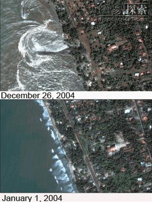 3、此亚洲海啸灾难的卫星图像是在2004年12月26日拍摄的,大约是在第一个波浪冲击斯里兰卡海岸后1小时拍摄的。此下方的图片是在此灾难性海啸发生之前的这片海岸的景致,显得十分宁静。而上图则是一片咆哮的海啸场面。