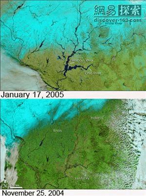 4、2005年1月的几天雨雪天导致流经美国印地安那州、伊利诺斯州和肯塔基州的河流泛滥成灾,淹没了周边地区。之后温和天气融化的雪水导致这一灾情进一步恶化。