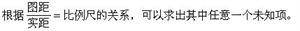 从上面的式子可以看出,图距相当于比的前项,实距相当于比的后项,比例尺相当于比值。根据这一关系,可以求出其中任何一个未知项。