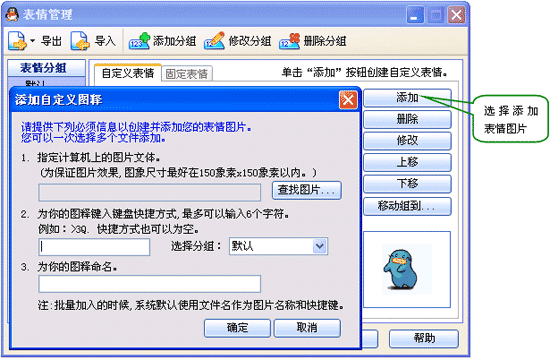 2.点击“添加”,在弹出窗口中,添加制作好的表情图片。可一次添加一个或多个表情图片。单个添加的表情可为其命名和定制快捷方式,批量添加时,系统将默认使用文件名做为图片名称和快捷键。表情文件默认添加到“默认”组中。