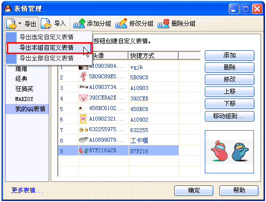 第三步:在QQ表情管理中导出表情文件为eip表情安装包格式。