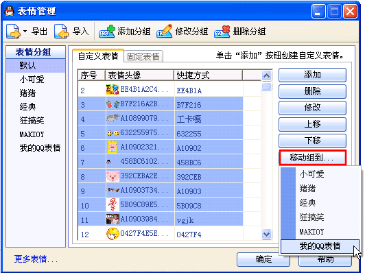 选中你添加的表情图片(可按住Ctrl键多选),点击“移动组到……”,在弹出的下拉菜单中选择你建立的组,即可为你添加的QQ表情文件建立一个表情分组。