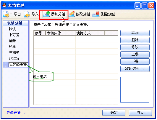 3.在表情管理器中点击“添加分组”,输入组名,为你添加的表情建立一个分组。
