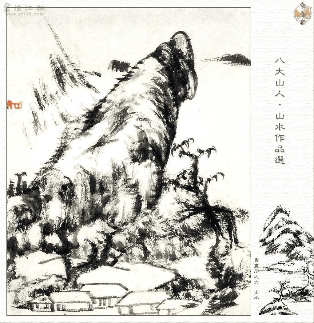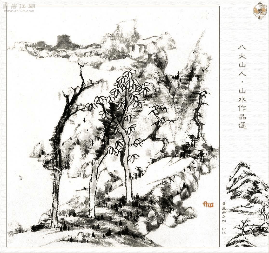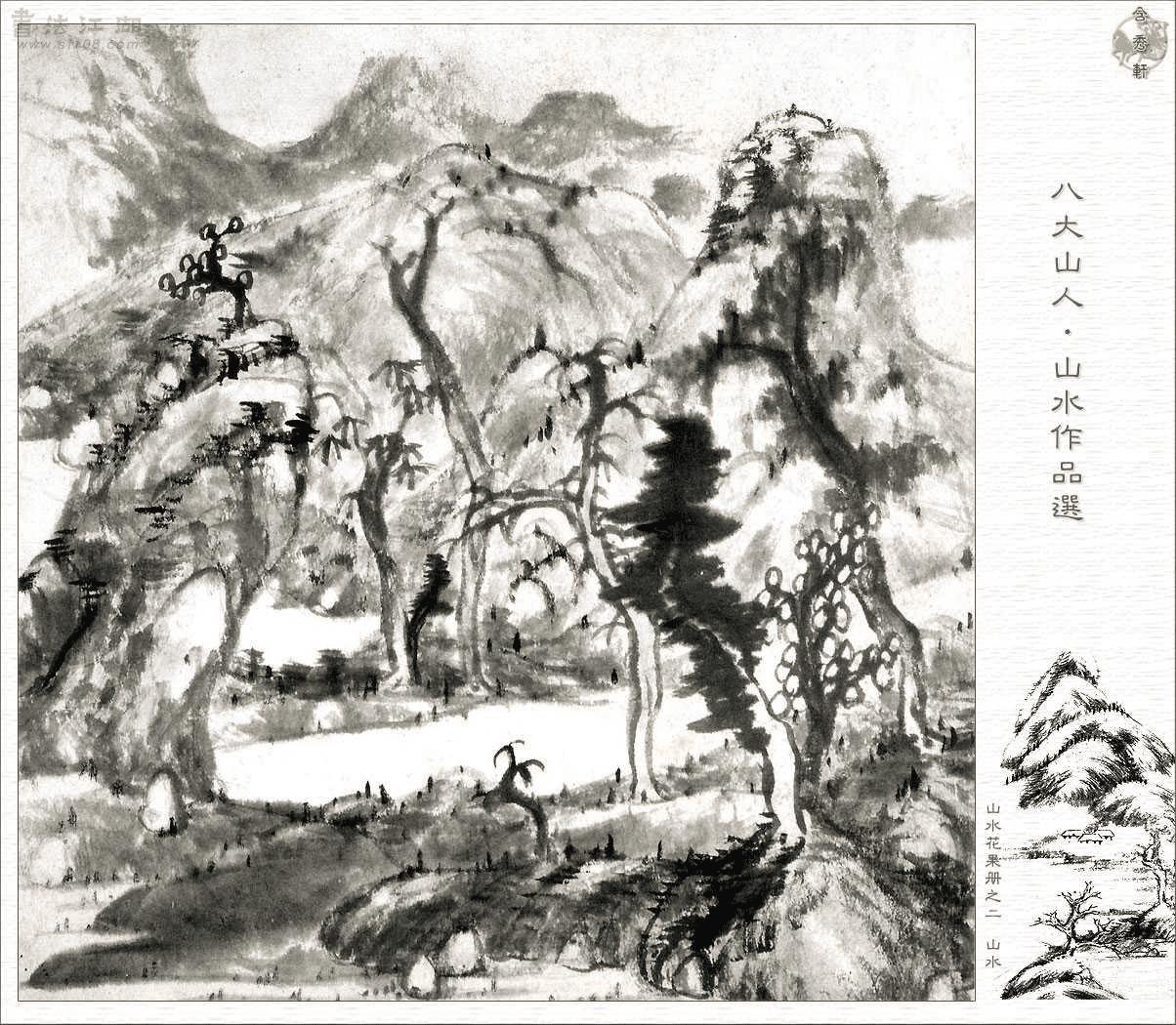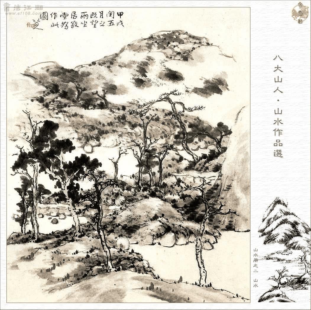 他的山水画多为水墨,宗法董其昌,兼取黄公望,倪瓒、他用董其昌的笔法来画山水,却绝无秀逸平和,明洁幽雅的格调,而是枯索冷寂,满目凄凉,于荒寂境界中透出雄健简朴之气,反映了他孤愤的心境和坚毅的个性。他的用墨不同于董其昌,董其昌淡毫而得滋润明洁,八大山人干擦而能滋润明洁。所以在画上同是“奔放”,八大山人与别人放得不一样,同是“滋润”,八大山人与别人润得不一样。一个画家,在艺术上的表现,能够既不同于前人,又于时人所不及。