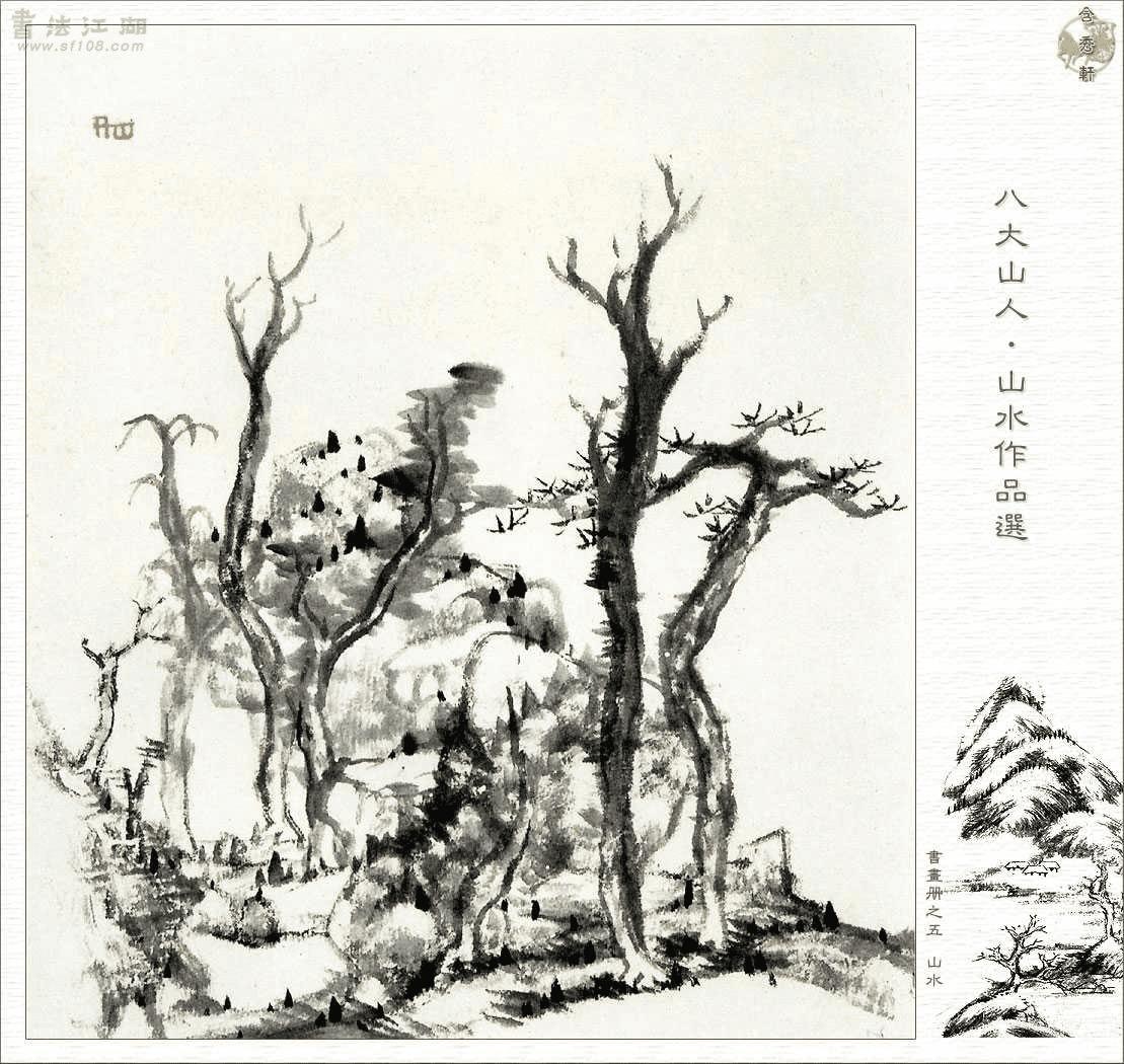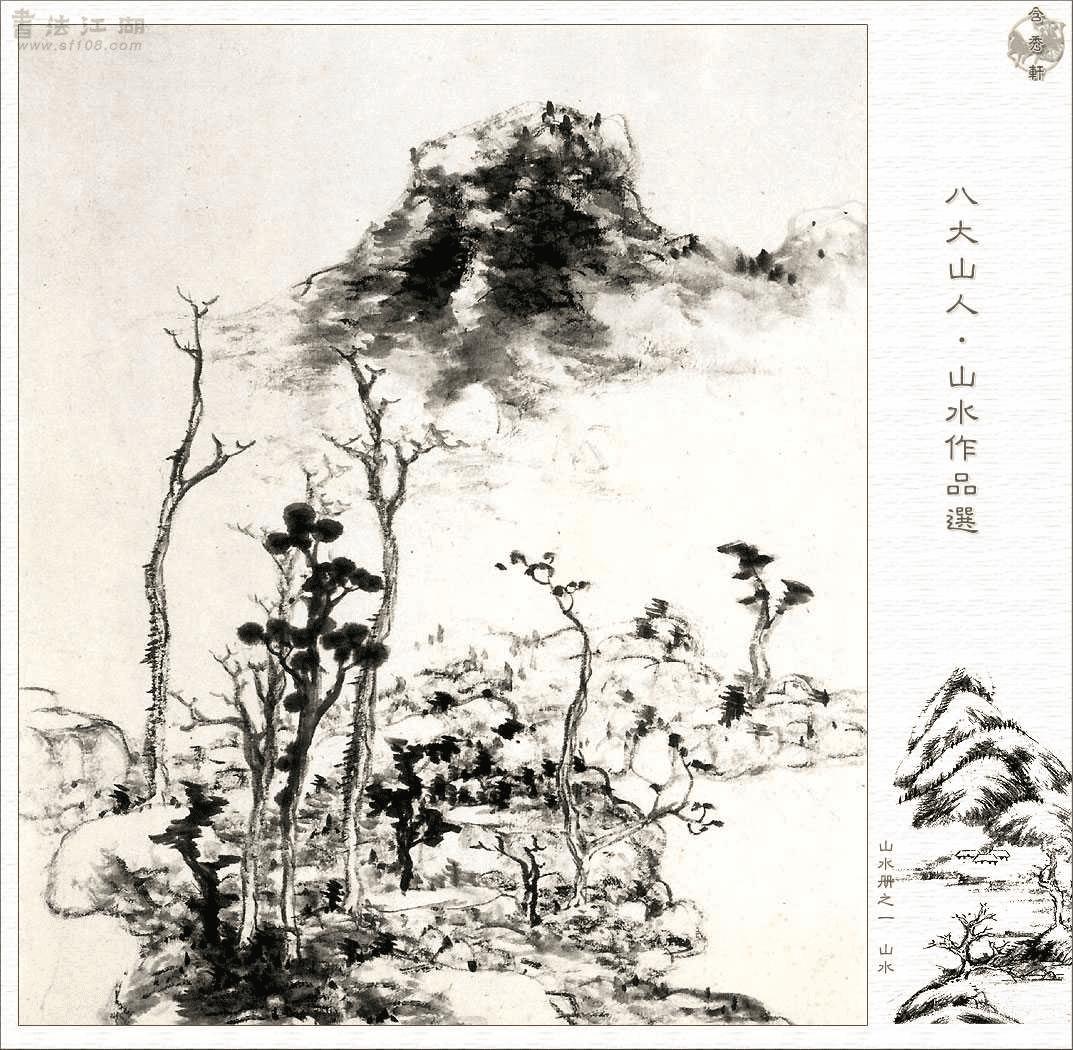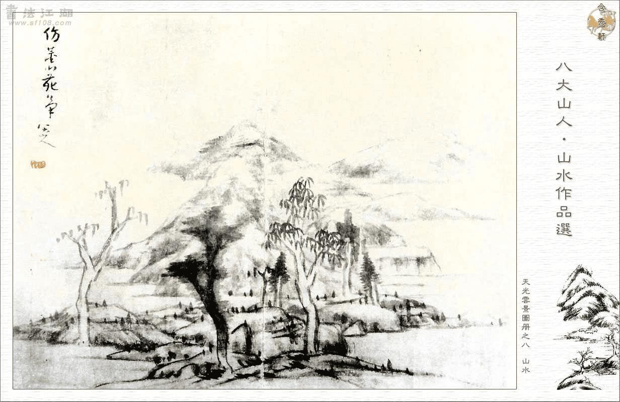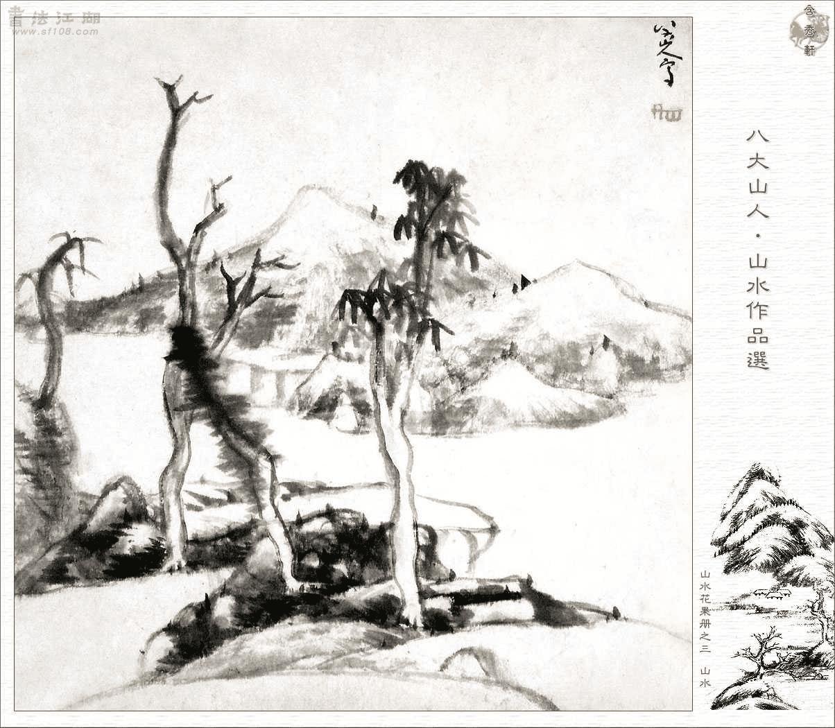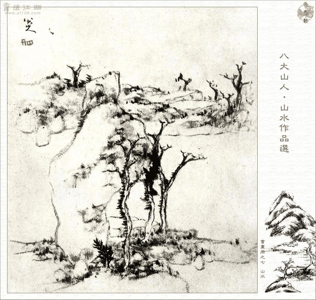 他的山水画多为水墨,宗法董其昌,兼取黄公望,倪瓒、他用董其昌的笔法来画山水,却绝无秀逸平和,明洁幽雅的格调,而是枯索冷寂,满目凄凉,于荒寂境界中透出雄健简朴之气,反映了他孤愤的心境和坚毅的个性。他的用墨不同于董其昌,董其昌淡毫而得滋润明洁,八大山人干擦而能滋润明洁。所以在画上同是“奔放”,八大山人与别人放得不一样,同是“滋润”,八大山人与别人润得不一样。一个画家,在艺术上的表现,能够既不同于前人,又于时人所不及。