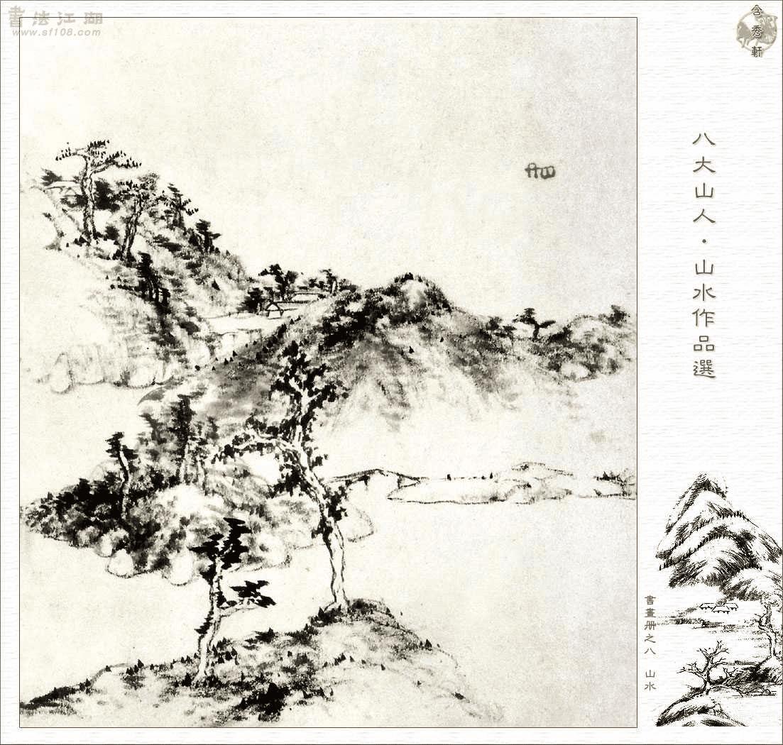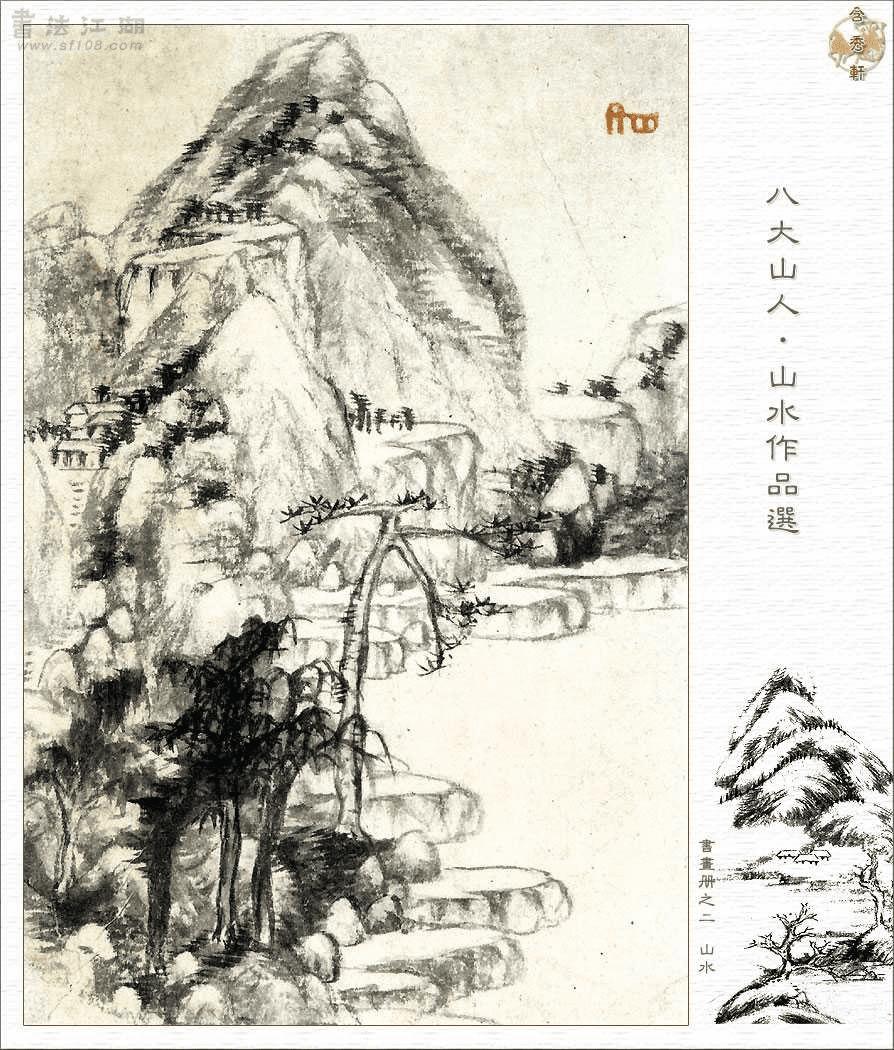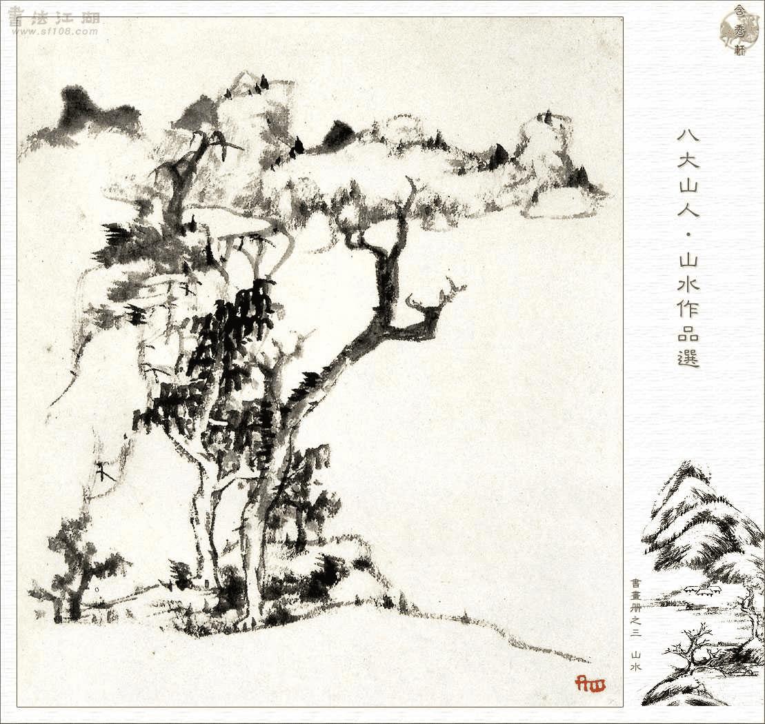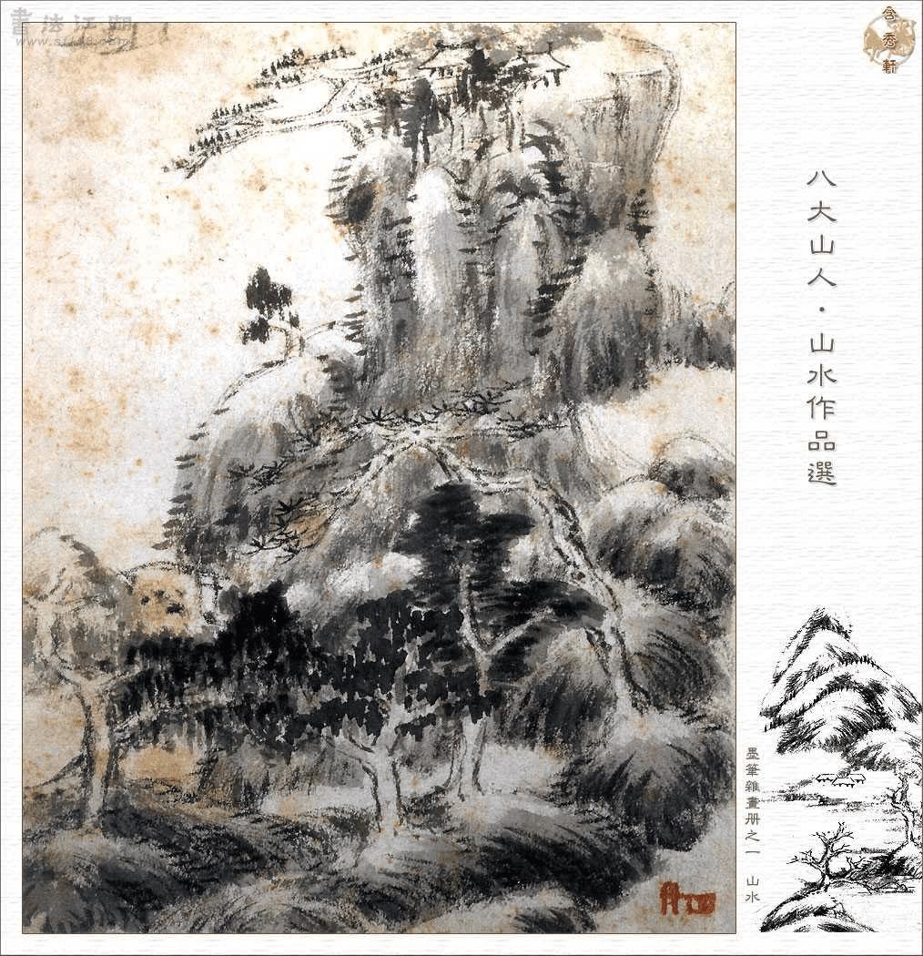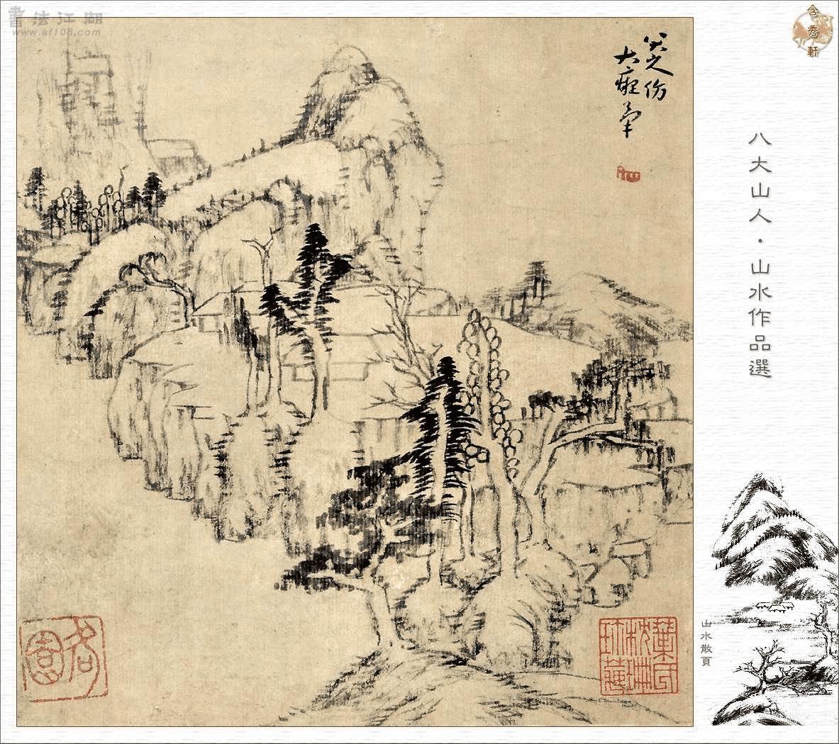 他的山水画多为水墨,宗法董其昌,兼取黄公望,倪瓒、他用董其昌的笔法来画山水,却绝无秀逸平和,明洁幽雅的格调,而是枯索冷寂,满目凄凉,于荒寂境界中透出雄健简朴之气,反映了他孤愤的心境和坚毅的个性。他的用墨不同于董其昌,董其昌淡毫而得滋润明洁,八大山人干擦而能滋润明洁。所以在画上同是“奔放”,八大山人与别人放得不一样,同是“滋润”,八大山人与别人润得不一样。一个画家,在艺术上的表现,能够既不同于前人,又于时人所不及。