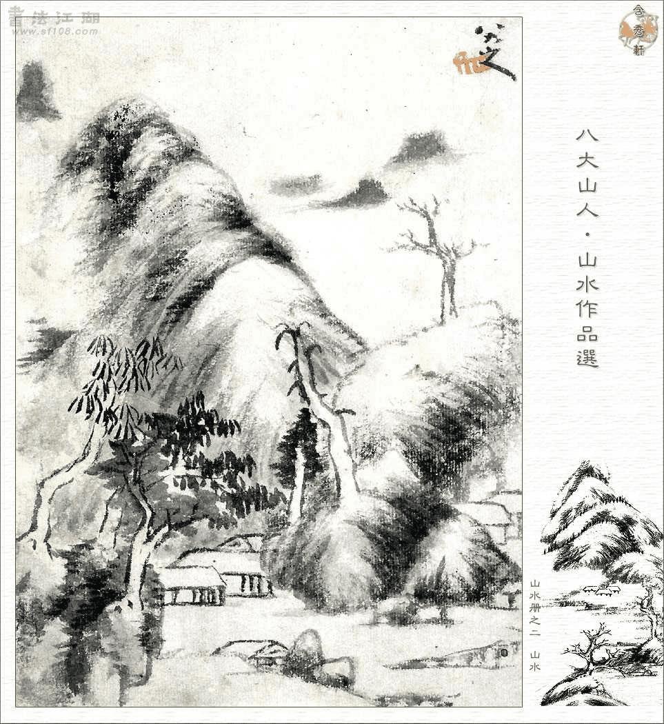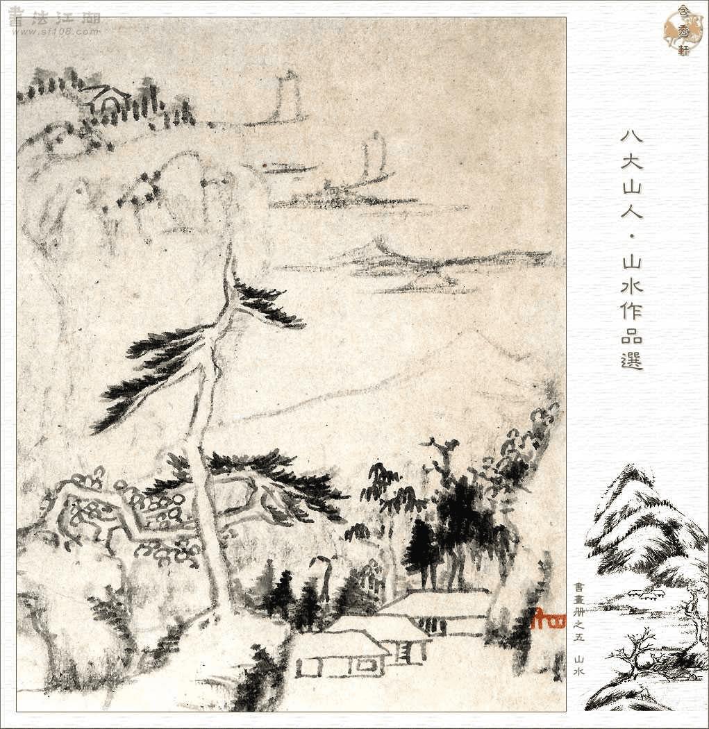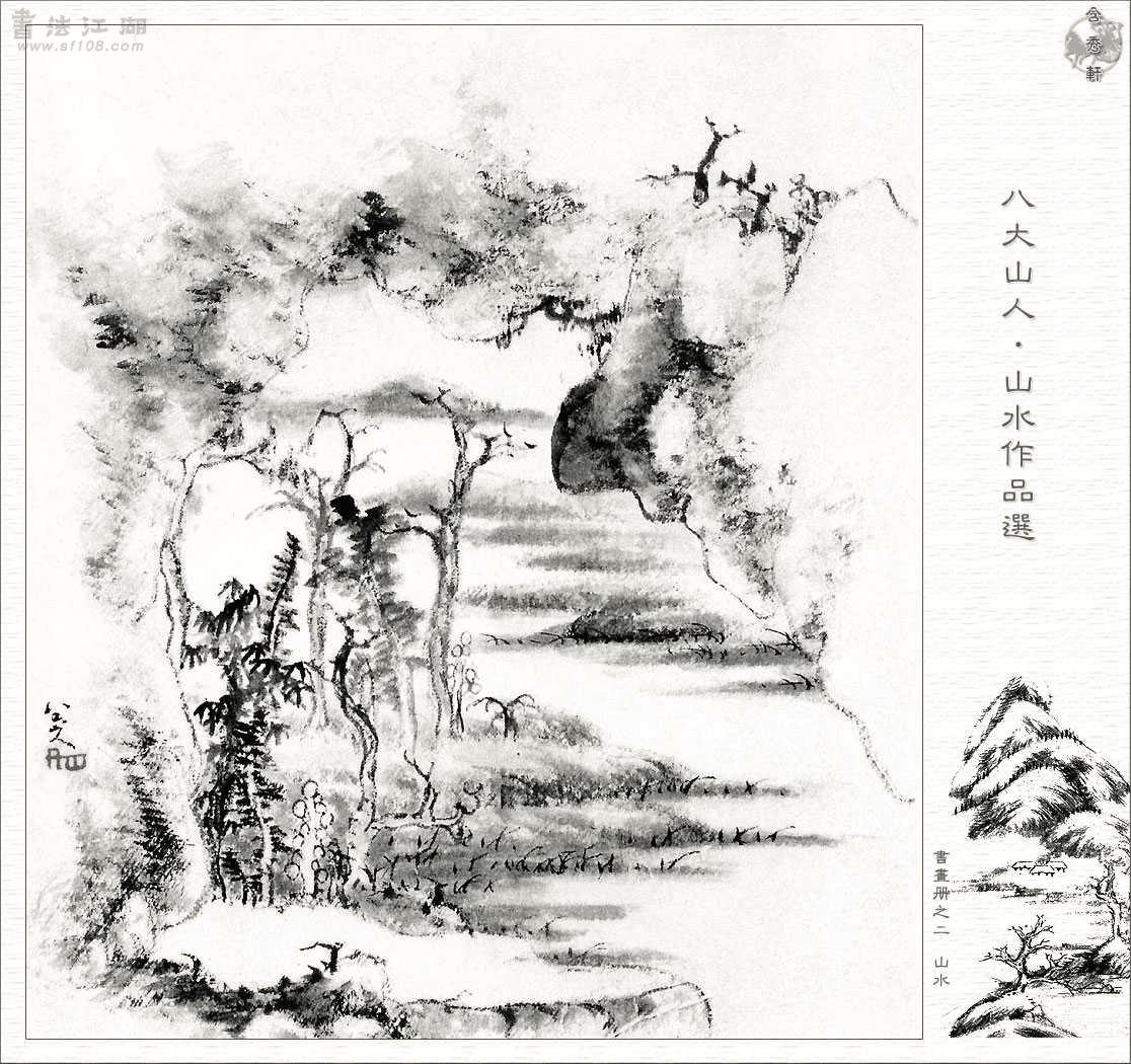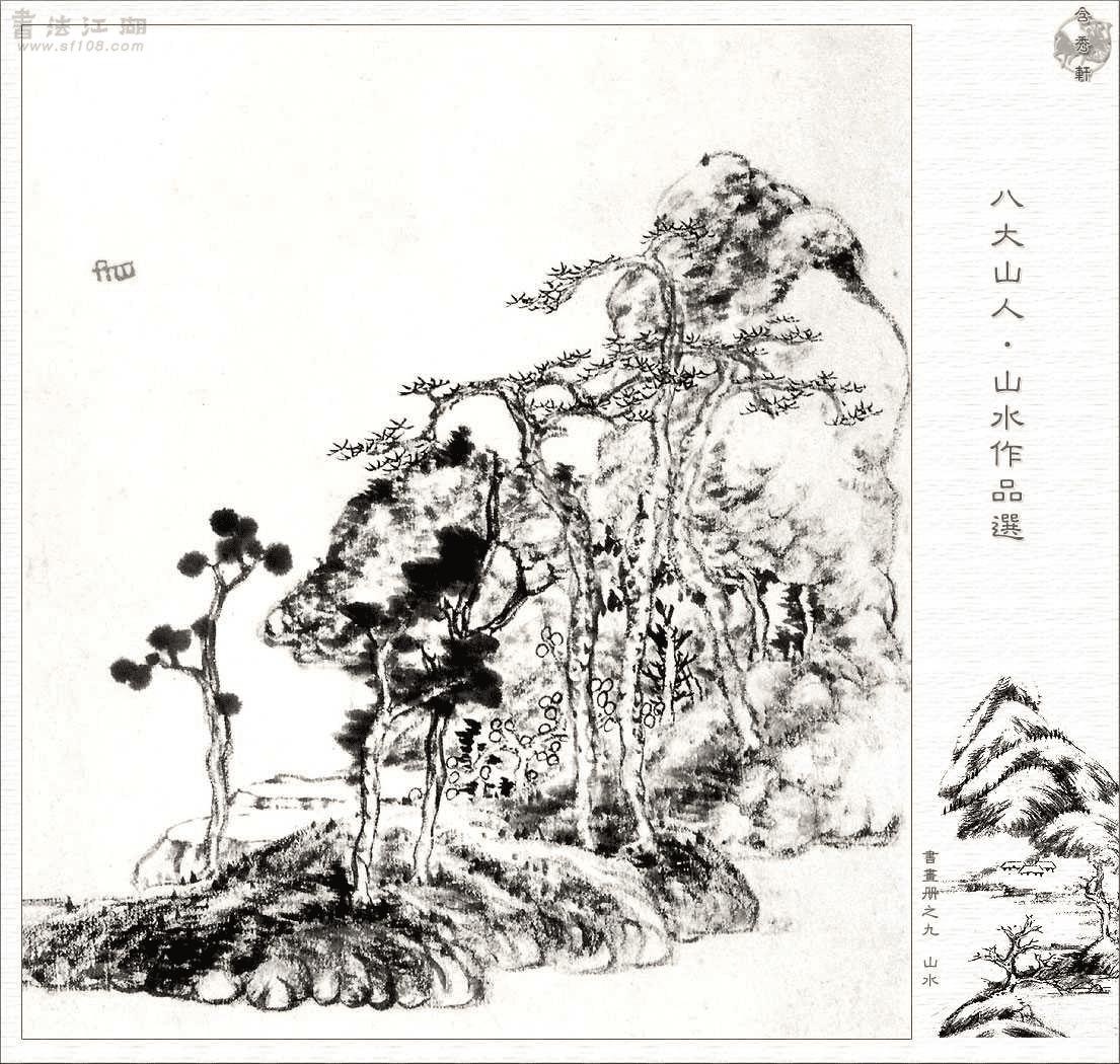 他的山水画多为水墨,宗法董其昌,兼取黄公望,倪瓒、他用董其昌的笔法来画山水,却绝无秀逸平和,明洁幽雅的格调,而是枯索冷寂,满目凄凉,于荒寂境界中透出雄健简朴之气,反映了他孤愤的心境和坚毅的个性。他的用墨不同于董其昌,董其昌淡毫而得滋润明洁,八大山人干擦而能滋润明洁。所以在画上同是“奔放”,八大山人与别人放得不一样,同是“滋润”,八大山人与别人润得不一样。一个画家,在艺术上的表现,能够既不同于前人,又于时人所不及。