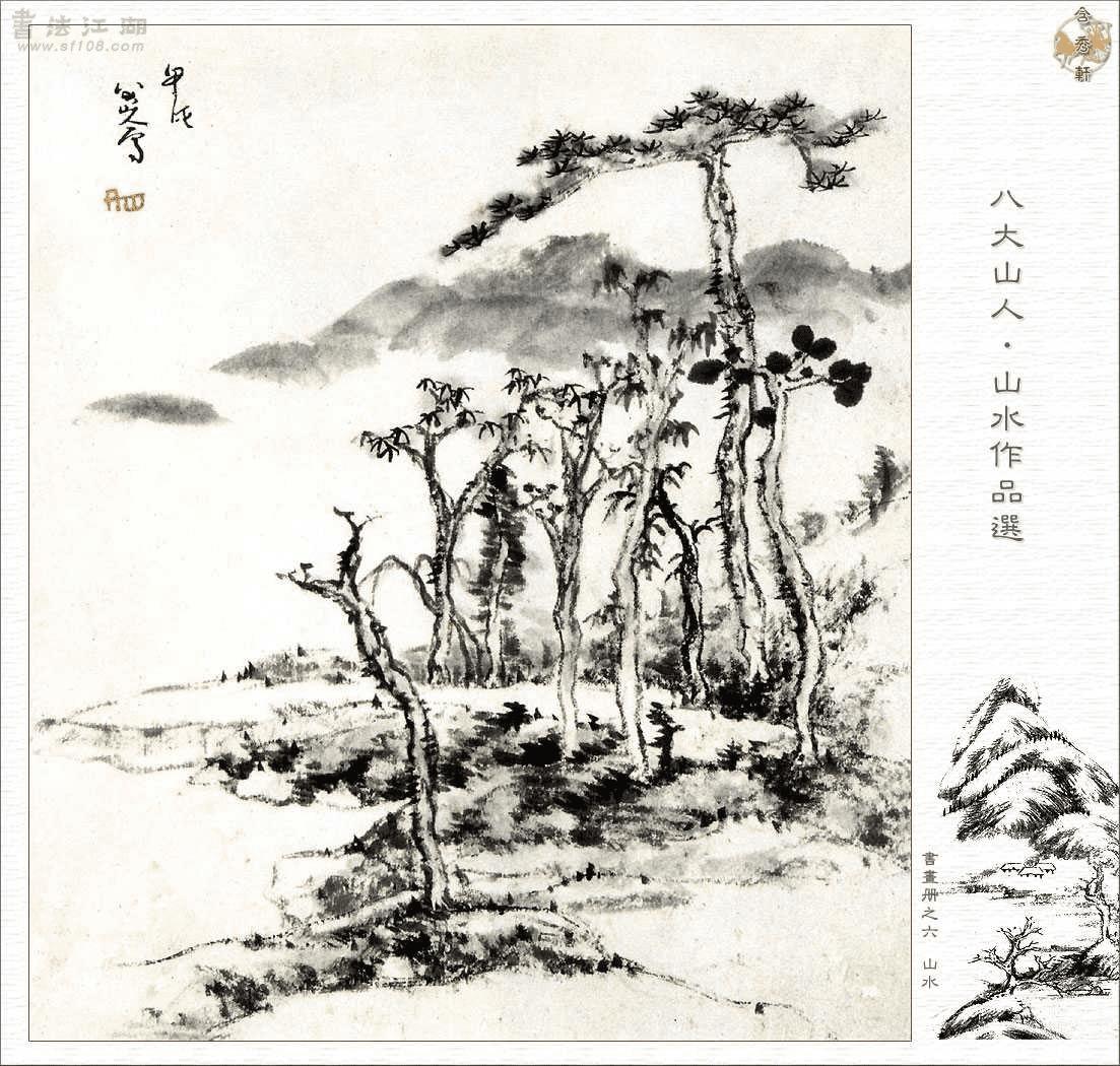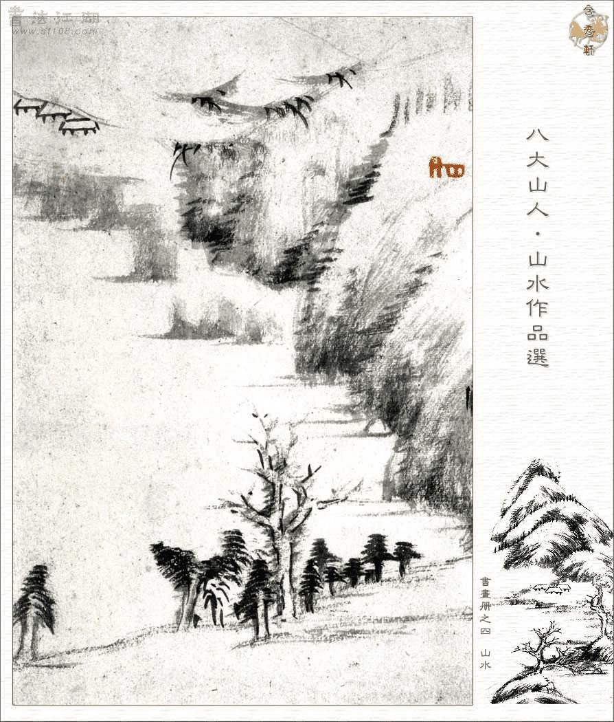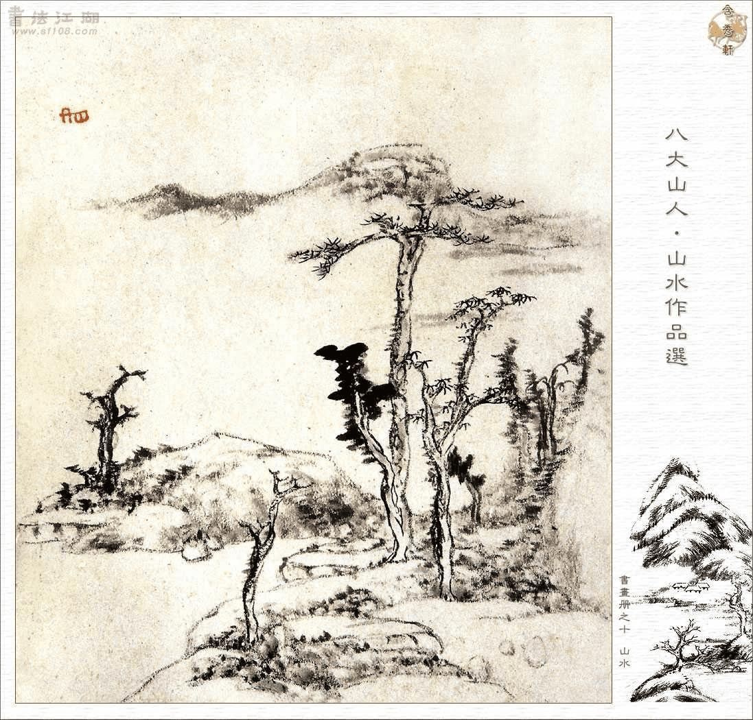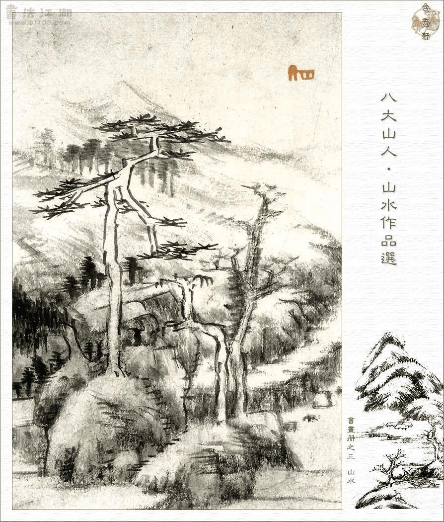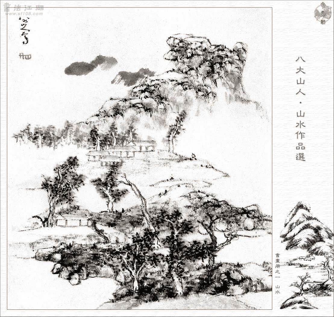 他的山水画多为水墨,宗法董其昌,兼取黄公望,倪瓒、他用董其昌的笔法来画山水,却绝无秀逸平和,明洁幽雅的格调,而是枯索冷寂,满目凄凉,于荒寂境界中透出雄健简朴之气,反映了他孤愤的心境和坚毅的个性。他的用墨不同于董其昌,董其昌淡毫而得滋润明洁,八大山人干擦而能滋润明洁。所以在画上同是“奔放”,八大山人与别人放得不一样,同是“滋润”,八大山人与别人润得不一样。一个画家,在艺术上的表现,能够既不同于前人,又于时人所不及。