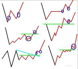 这就是其中的6种模型.黑色代表前期下跌,红色代表上涨,深蓝色代表买进的资金.绿色,浅蓝色代表阻力.