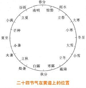 春分和秋分正处春、秋两季中间,夏至和冬至正处夏、冬两季中间。这样一年可用春分、夏至、秋分、冬至划分为4段,如将每段再分成6小段,太阳在黄道上移动15度,每小段约15天左右,全年就可分为24小段,农历上称太阳在黄道上从0 度起算,每15度为一节气,全年共有二十四节气。