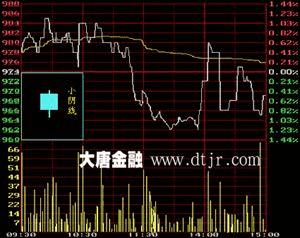 小阴星的分时走势图与小阳星相似,只是收盘价格略低于开盘价格。表明行情疲软,发展方向不明。(资料来源:大唐金融 www.dtjr.com)
