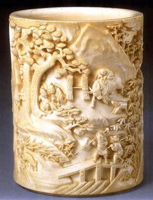 27、清中期,象牙雕开光山水人物图笔筒,高13厘米,口径9.3厘米,清宫旧藏