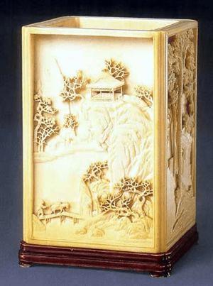 29、清中期,象牙雕山水人物图方笔筒,高10.2厘米,口径6.3厘米,足6.8厘米,清宫旧藏