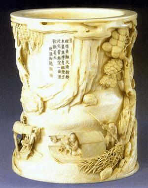 28、清中期,黄振效,象牙雕渔家乐图笔筒,高12厘米,口径9.7厘米,清宫旧藏