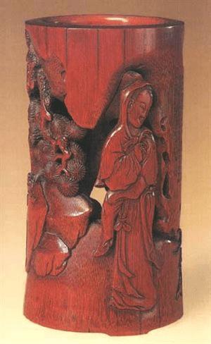 2、明晚期,朱三松,竹雕仕女笔筒,高14.6厘米,口径7.8厘米,足径7.7 厘米,清宫旧藏