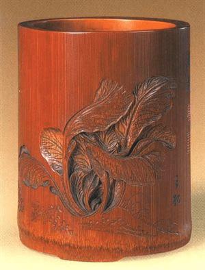 1、明晚期,朱三松,竹雕春菜图笔筒,高13.7厘米,口径10.8厘米,足径10.5厘米,清宫旧藏