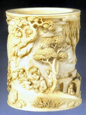 25、清早期,象牙雕松荫高士图笔筒,高13.7厘米,口径10.4厘米,清宫旧藏