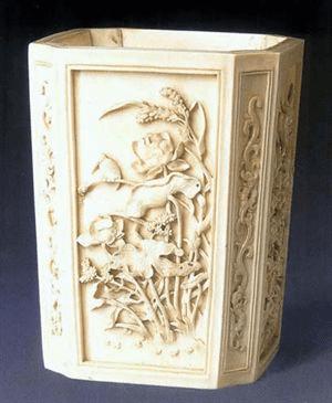 24、清早期,象牙雕四季花卉图方笔筒,高12.1厘米,口径9.3厘米,清宫旧藏