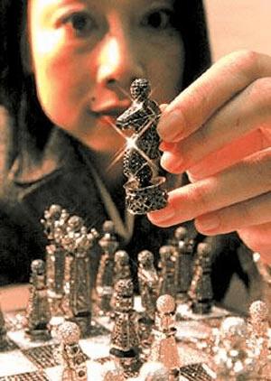 2005年,法国著名艺术家和珠宝设计师伯纳德·马昆设计出这款皇家钻石象棋,堪称世界上最贵的象棋。30多名能工巧匠在马昆的指导下,花了大约4500个小时一点一点制作出,一共用了9900颗黑色和白色钻石共186.09克拉,还有1168.75克的宝石,总共价值50万美元(约合人民币375万元)。