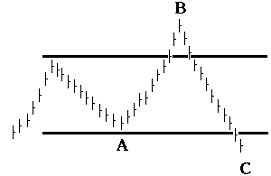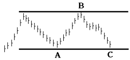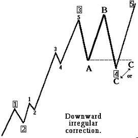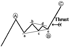 在平坦型调整中,每一浪的长度是相同的。经历过一次五浪的推动模式之后,市场进入浪A。而后,市场波动向上形成浪B,并到达前期高位。最后,市场下滑形成浪C,并到达前期浪A的低位。