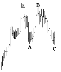 一个“之字型调整”是一个三浪模式,其中B浪不能回调到A浪的75%之上。C浪将在A浪之下形成一个新低,之字型调整的A浪经常会有五浪。在另外两个调整(平坦型调整、不规则型调整)中,A浪有三浪。这样,如果你能识别一个有五浪组成的A浪,你就能断定这个调整是“之字型调整”型。