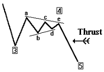 大多数普通的三角形是作为第4浪出现的(大五浪的第4浪)。一个三角形有时可以看作是一个拥有三个浪调整的B浪。三角形是十分难以琢磨和令人混淆的。在采取行动之前,交易者必须仔细研究一下这种模式。价格将趋向于以一个迅速的“刺”冲破三角形。