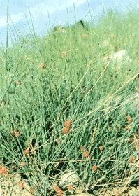 植物形态草本状小灌木,高20~40cm。木质茎短,常匍匐;草质茎绿色,长圆柱形。直立,节明显,节间长2~6cm,直径约2mm,有不明显的细纵槽纹。鳞叶膜质鞘状,长3~4mm,下部约1/2合和生,上部2(3)裂,裂片三角状披针形,先端渐尖,常向外反曲。雌雄异株,雄球花3~5聚成复穗状,顶生;雌球花宽卵形,多单生枝端,雌球花成熟时苞片增大,肉质,红色,成浆果状。种子2,卵形。花期5~6月。种子成熟期7~8月。