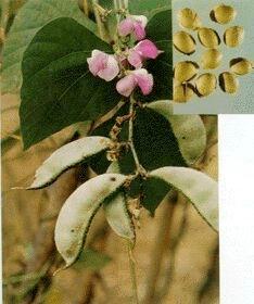 植物形态一年生缠绕草本。三出复叶,先生小叶菱状广卵形,侧生小叶斜菱状广卵形,长6~11cm,宽4.5~10.5cm,顶端短尖或渐尖,两面沿叶脉处有白色短柔毛。总状花序腋生,花2~4朵丛生于花序轴的节上。花冠白色或紫红色;子房有绢毛,基部有腺体,花柱近顶端有白色髯毛。荚果扁, 形或半椭圆形,长5~7cm,种子3~5颗,白色或紫黑色。花果期7~10月。