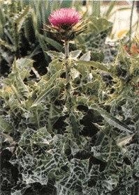 植物形态一二年生草本。茎直立,高30~200cm,多分枝,光滑或被蛛丝状毛,有纵棱槽。叶互生,基部叶常平铺地面,成莲座状,长椭圆状披针形,深或浅羽状分裂,缘齿有尖刺, 长40~80cm,宽10~30cm,表面亮绿色,有乳白色斑纹,基部抱茎;中部、上部叶片渐小,上部叶披针形。头状花序直径3~6 cm,单生枝顶,总苞宽球形,总苞片革质,顶端有长刺;管状花紫红色、淡红色或少有白色。瘦果长椭圆形,暗褐色或黑色。有纵条纹及白色斑纹;冠毛多数,白色,不等长,基部合生成环。花期5~6月,果期6~7月。