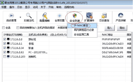 目前国内有很多局域网控制软件、网管监控软件,一般都有IP和MAC地址绑定的功能。通常,通过此类网管软件可以轻松扫描到局域网电脑IP地址和MAC地址,然后点点鼠标就可以实现绑定。例如,有一款“聚生网管”软件(下载地址:http://www.grabsun.com/soft.html),只需要在局域网一台电脑安装,就可以扫描到局域网所有电脑的IP地址和MAC地址,然后点点鼠标就可以绑定了,绑定之后局域网电脑将无法修改IP地址和MAC地址,一旦修改之后就无法上网,从而阻止了电脑修改IP地址的行为,如下图所示: