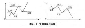 2.支撑线和压力线的作用。如前所述,支撑线和压力线的作用是阻止或暂时阻止股价朝一个方向继续运动。我们知道股价的变动是有趋势的,要维持这种趋势,保持原来的变动方向,就必须冲破阻止其继续向前的障碍。比如说,要维持下跌行情,就必须突破支撑线的阻力和干扰,创造出新的低点;要维持上升行情,就必须突破上升压力线的阻力和干扰,创造出新的高点。由此可见,支撑线和压力线有被突破的可能,它们不足以长久地阻止股价保持原来的变动方向,只不过是暂时停顿而已(图6—8)。