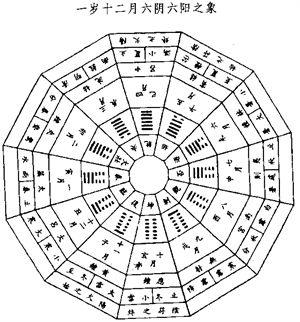 这图表自内向外为序的第二圈,画的是卦象,第三圈是地支,代表月份。如今天是中国历的十月,为亥月,天气已冷,但有几天暖和,是“小阳春”。十一月是子月,十二月是丑月……,依次配合,再外面第四圈,应钟、黄钟、大吕,是中国音乐的名词,这十二个音乐上的名词,通称为律吕,也是气候的变化。最近看到一份报上,有一位研究音乐的教授大骂律吕的文章,其实是他不懂什么是律吕。另外一位大学者,说外国音乐只有七个音阶,而我们中国有十二个律吕,这又错了。还有一位申请某项经费的老教授的论文中,也说到律吕的问题,但似是而非,所以要研究中国文化,这些都要了解的。再第五圈是二十四个节气,将来研究《易经》象数方面,亦即科学方面,这个十二辟卦的法则,一定要记祝一年当中,分十二个月,这十二个月,一半是阴,一半是阳。以一天计算,同样一半是阴,一半是阳。以每天的子、丑、寅、卯、辰、巳六个时辰,亦即深夜的十一时零分零秒至次日上午的十时五十九分六十秒是阳,而午、未、申、酉、戌、亥六个时辰,亦即上午的十一时零分零秒至夜间的十时五十九分六十秒为阴,这是我们中国古代的科学。现代西方人研究中国针灸,也就以现代的科学来求证,证明它的道理,不能说它不科学。