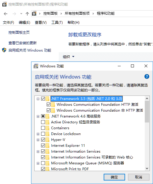 1.打开控制面板--程序和功能--启用或关闭Windows功能