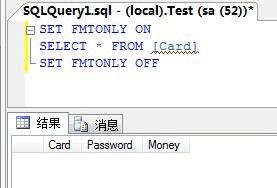 有时,我们需要获得某张表所有的元数据,我们可能想到的是通过查询系统表获得,但是这比较繁琐,而在SQL Server2005(包含)以后,提供了一个比较简单的操作,只返回表的所有元数据,而没有行数据,它就是SET FMONLY {ON|OFF}命令。如图: