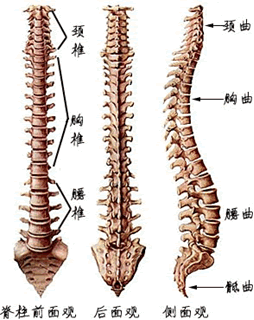 人体脊椎包括颈椎7个,胸椎12个,腰椎5个,骶骨呈三角形接第5腰椎。其从侧面观是呈“S”型。