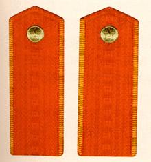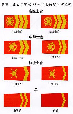 礼仪肩章是担负天安门国旗护卫、外宾车队护卫等重大礼仪任务的武警士兵佩带的一种特殊肩章。武警士兵礼仪肩章分为列兵、上等兵、下士、中士、上士二等五级。
