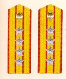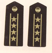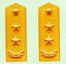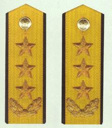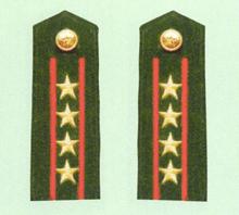 ①陆军上将:为我军现行军衔制中陆军最高军衔、军衔条例规定,中央军委副主席、军 委委员、总参谋长、总政治部主任一律授予陆军上将军衔。陆军上将还是正大军区职军官的主要军衔。正大军区职包括副总参谋长、总政治部副主任、总后勤部部长、政委、大军区司令员、政委等。