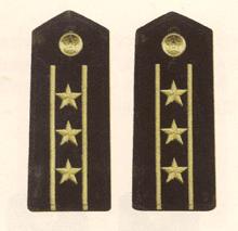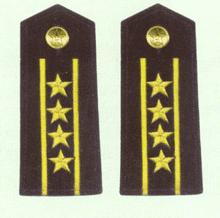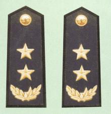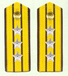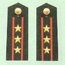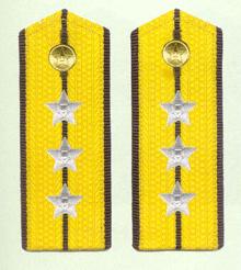 ①海军上将:为海军正大军区职军官的主要军衔,也是我军现行军衔制中海军最高军衔,一般只授予海军司令员、海军政治委员。其主要标志为:金黄色肩章两佩镶有代表海军的黑色边饰,肩章底版上缀有仿刺绣金色枝叶和三颗金色星徽。