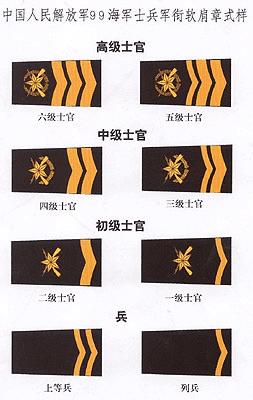 ③海军少将:为海军正军职、副军职军官的主要军衔。此外,海军少将还是海军副大军区职和正师职军官的辅助军衔,即资历较浅的海军副大军区职军官及资深的海军正师职军官,也可被授予海军少将军衔。