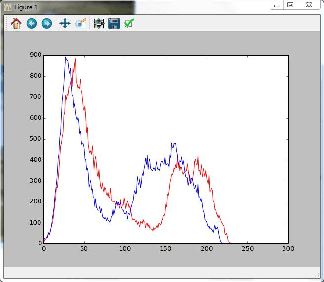 在Python中利用opencv中的calcHist()方法获取其直方图数据,返回的结果是一个列表,使用matplotlib,画出了这两张图的直方图数据图