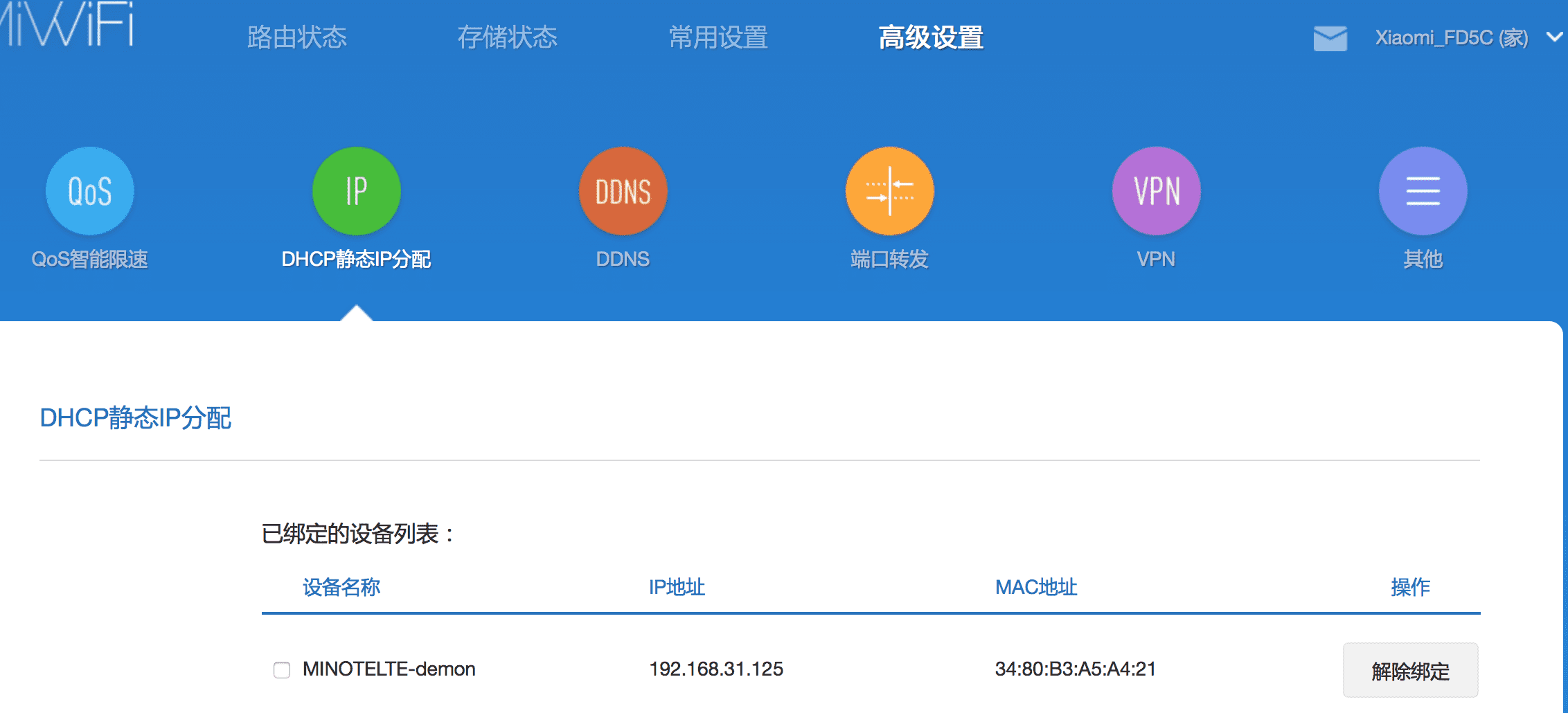 对了 还有一点需要注意的是,由于局域网ip可能不会固定,正好本人用的是小米路由器,有绑定设备ip的功能,这样ip就固定啦