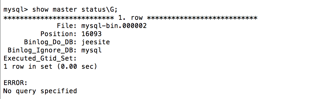 这中问题按照网上大部分的解决方法是,首先查看master的状态,并记录下相关信息